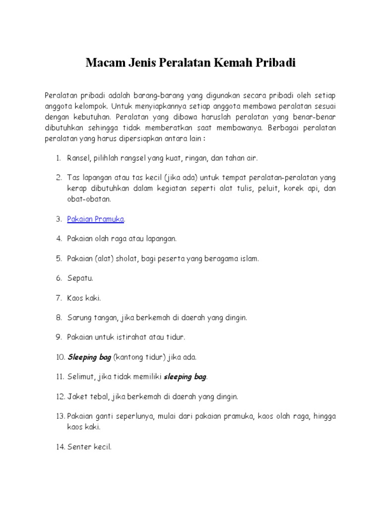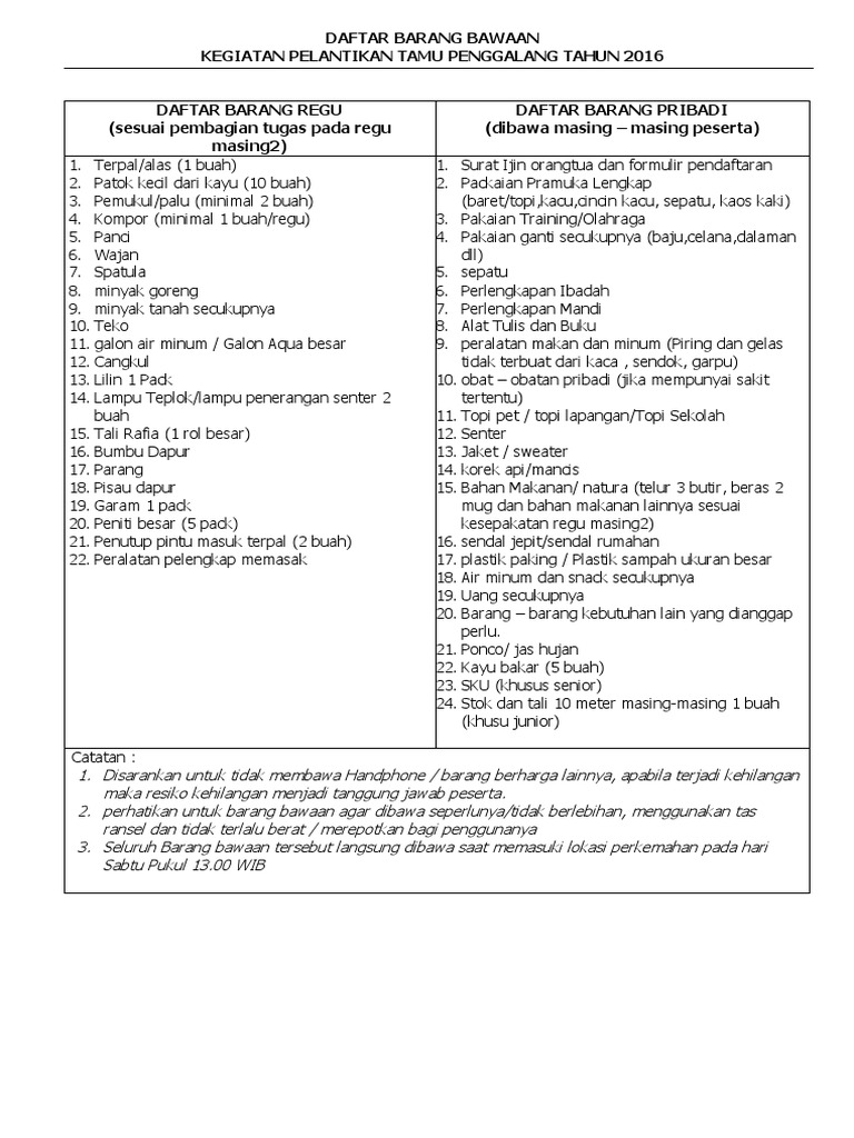 Modul Pramuka Penegak from imgv2-1-f.scribdassets.com Bahan makanan, seperti beras, mi instan, dan lauk. Jangan asal memilih, kamu juga harus jeli untuk mengecek segala kelengkapannya sebelum dibawa. Bahan makanan, seperti beras, mi instan, dan lauk. Peralatan memasak, seperti kompor masak, panci, wajan, timba air, sendok sayur, pisau, dll. Peralatan berkemah adalah peralatan yang dibawa sewaktu akan berkemah. Waktu lama berkemah, dan lokasi tujuan ikut menentukan barang apa saja yang harus dibawa, jadi sebaiknya disesuaikan, tidal semua barang harus dibawa, nanti malah dikira orang mau pindahan rumah ? Berikut perlengkapan yang memudahkan anda saat berkemah menggunakan mobil. Ini juga barang wajib yang harus dibawa.